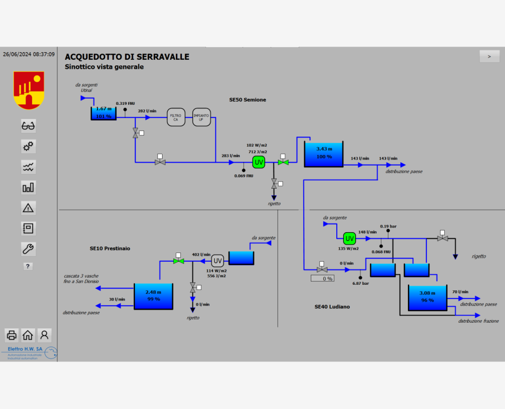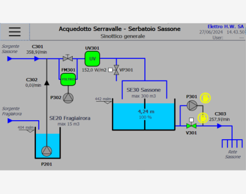 Fornitura di nuovi quadri elettrici e dei software di controllo e comando, espansione e messa in rete delle installazioni esistenti. Allestimento di un sistema completo di gestione dell'acquedotto.